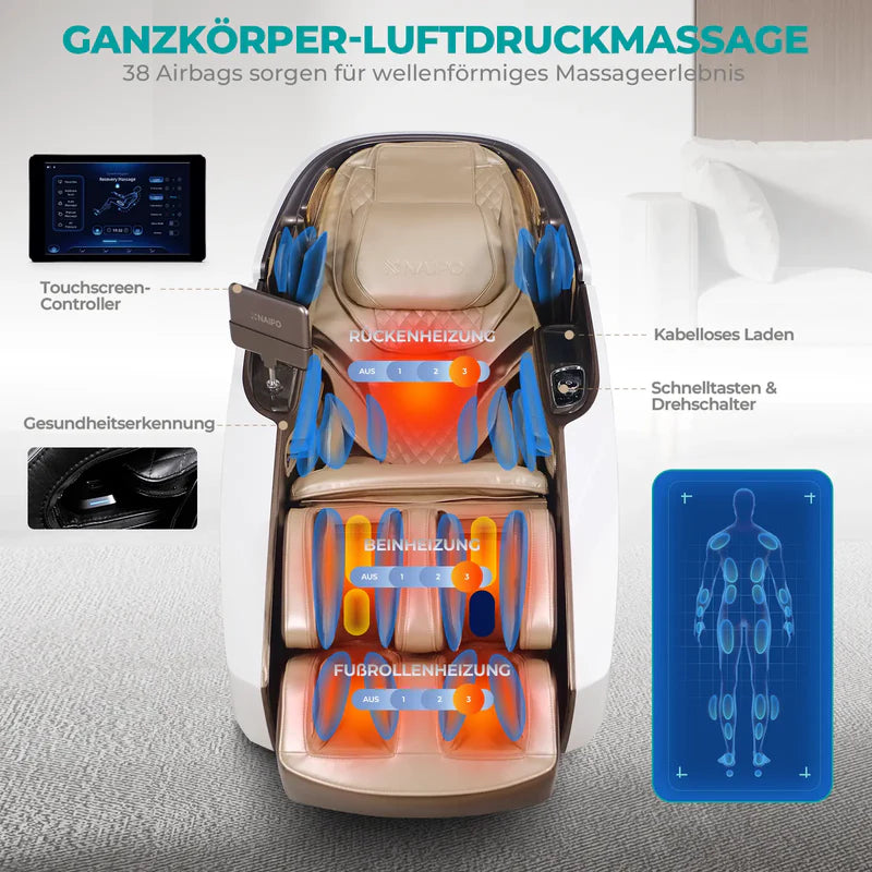 Die Steuerung ist intuitiv: Touchscreen-Controller, Armlehnentasten und Drehschalter stehen bereit. Offline-Sprachsteuerung, drahtloses Laden plus USB, Speicherfunktion und Reset machen den Alltag leicht.