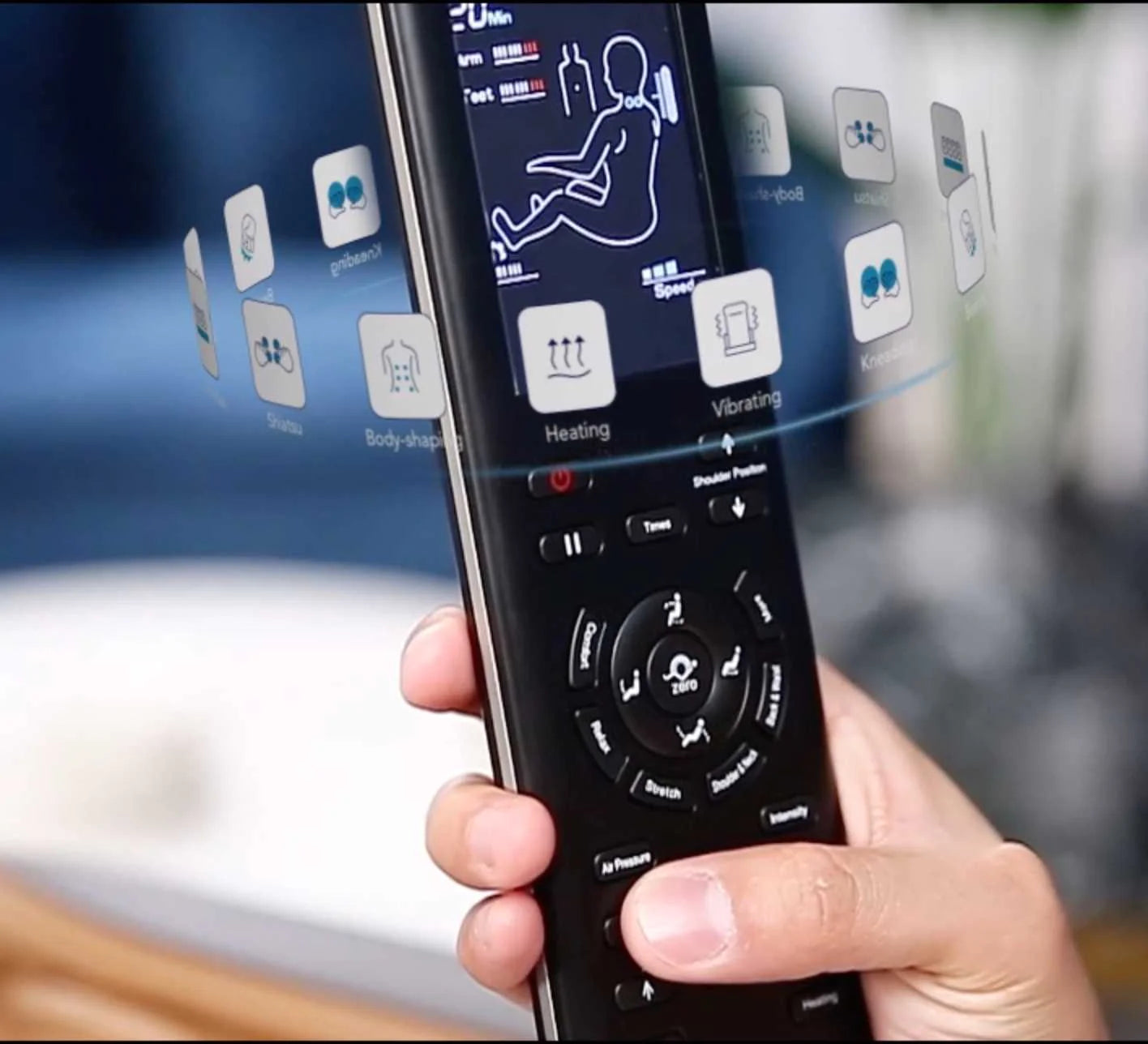 These allow you to set the massage area (full body, partial area or fixed point), select the massage roller speed from five levels and adjust the position of the massage rollers up or down during the fixed point and partial area massage.